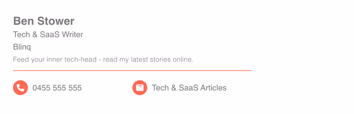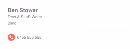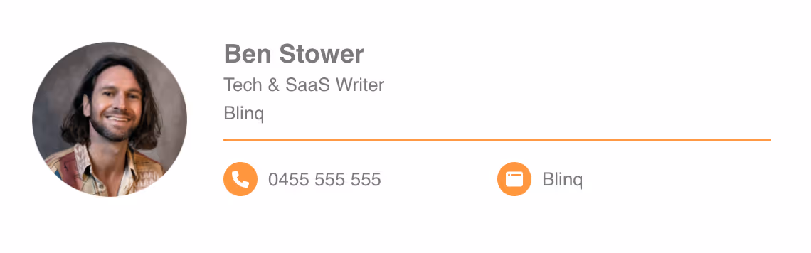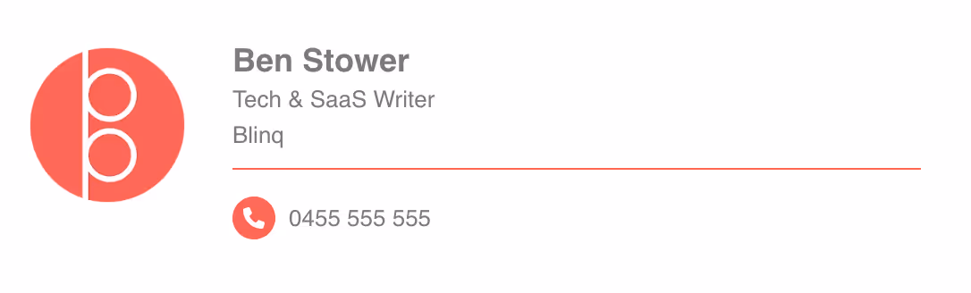 If the first email signature example feels a little too indistinct, you could give it more branding. This is a good option if you want to keep branding consistent across your team (Blinq can help manage this via a central admin) while ensuring your email signatures are short, sweet and simple.