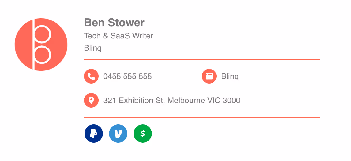 If you run an ecommerce business or any organization that benefits from online transactions, including links to payment platforms in your email signature can help streamline the buyer journey. You can embed your own links into your signature or use a platform like Blinq to include links to payment options at the bottom. We have link buttons to PayPal, Venmo and CashApp, but you can also add custom website links to other forms of payment.