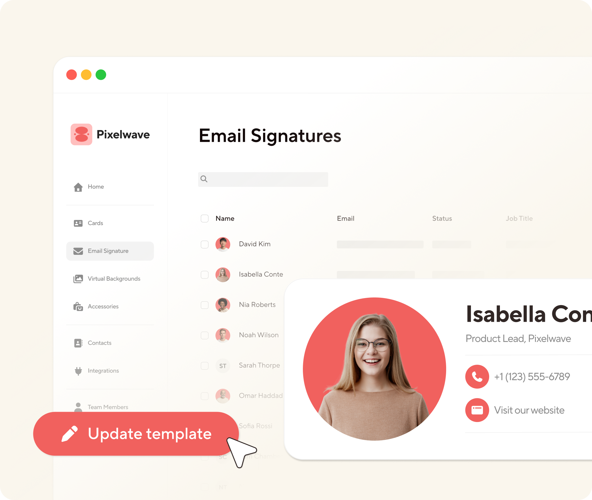 Create and sync all team email signatures from one place. Update logos, colors, or links once, and changes automatically apply.